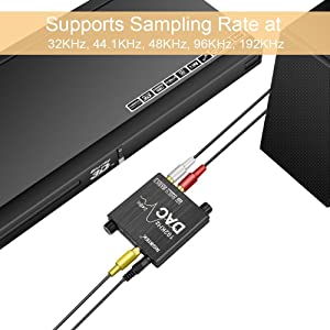 Support 32KHz,44.1KHz,48KHz,96KHz, 192Khz 24Bit sampling rate on the optical and SPDIF signal,built-in interference immunity and no signal input squelch circuit