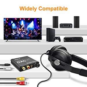 Widely compatible,the digital-to-analog converter is compatible with TV, DVD, PS3, PS4, audio amplifier system, earphones and other devices