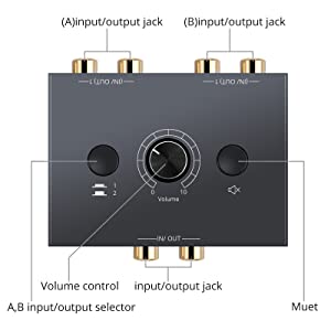 - Select audio input between 1 and 2 with 1/2 switch and get one output;