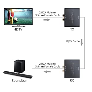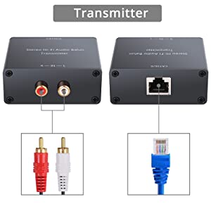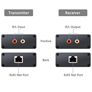 Plug the Left (White) and Right (Red) stereo audio RCA connectors of the transmission Balun into the HI-FI audio output of thesource component, Plug the Left (White) and Right (Red) RCA connectors from theReceive Balun into your desired input component. Insert the CAT5 cable intoboth ends of the Baluns. You may use standard EIA 568A/B Termination.